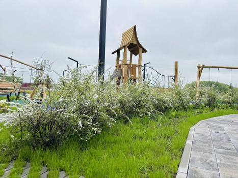 Двор без машин, парковка за домом. Во дворе оборудованы зоны для детей и занятий спортом.
