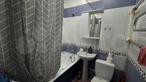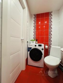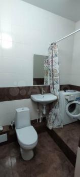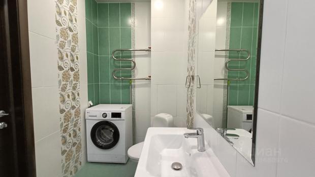 Ванная комната совмещенная, оформлена в светлых тонах, установлена ванна и стиральная машина. Лоджия застеклена, что добавляет дополнительное пространство и уют.