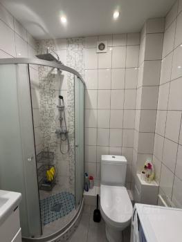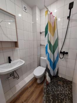 Кухня оборудована необходимой бытовой техникой, включая холодильник и плиту. Есть обеденный стол и стулья. Ванная комната и туалет раздельные, выполнены в светлых тонах.