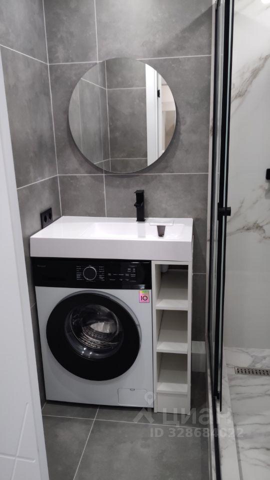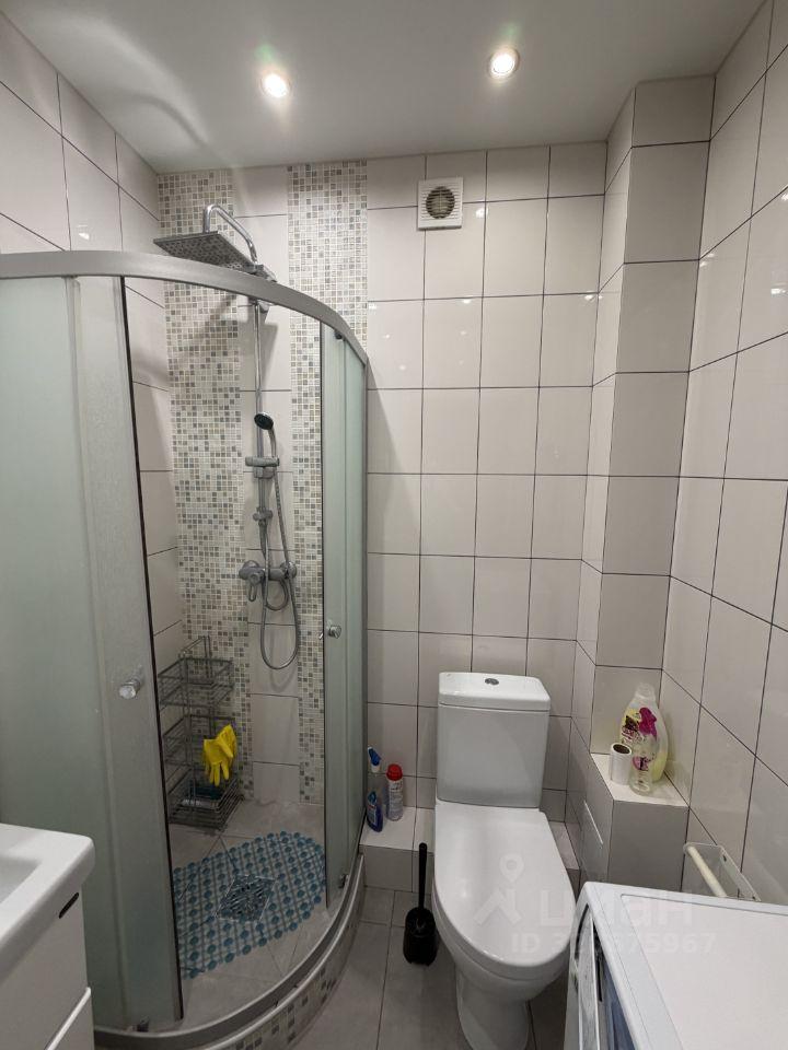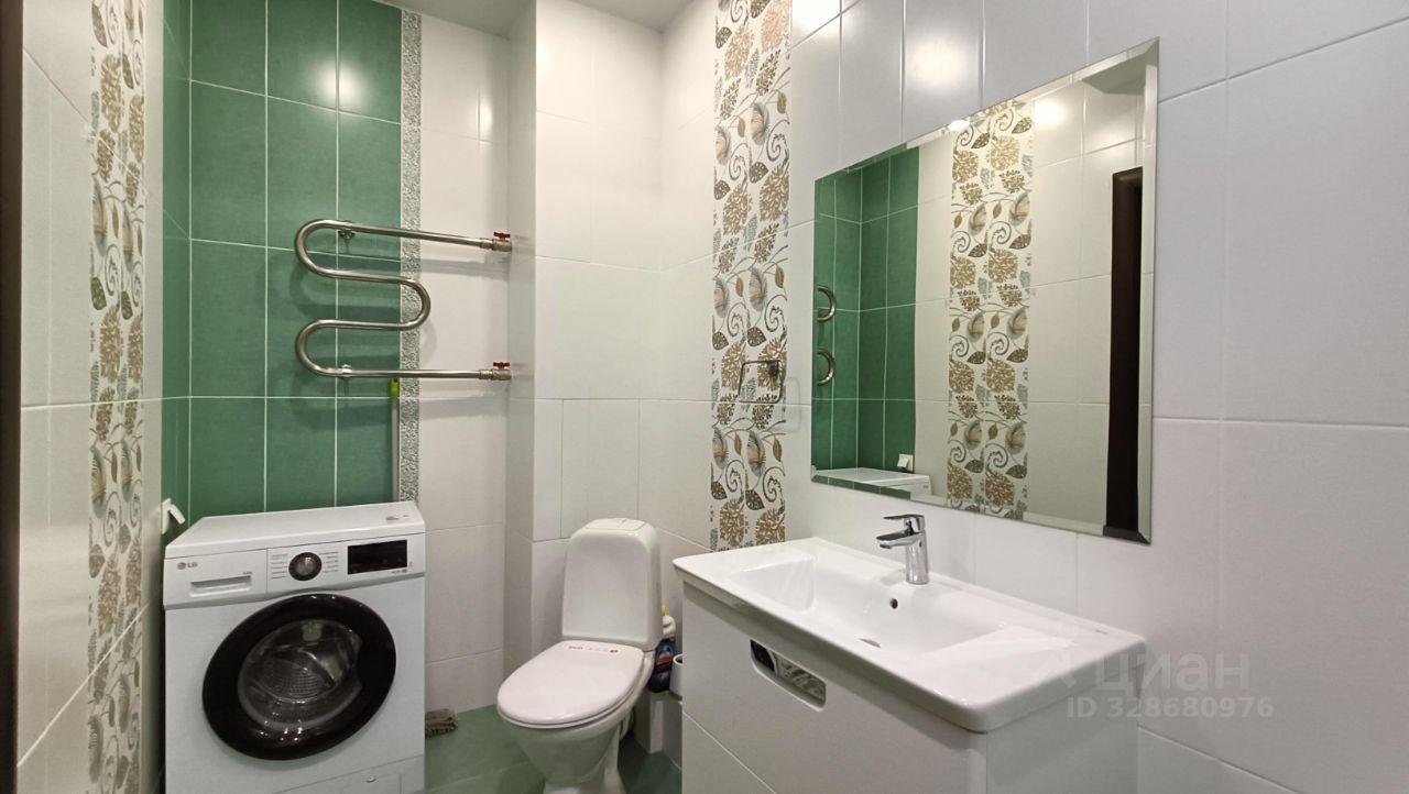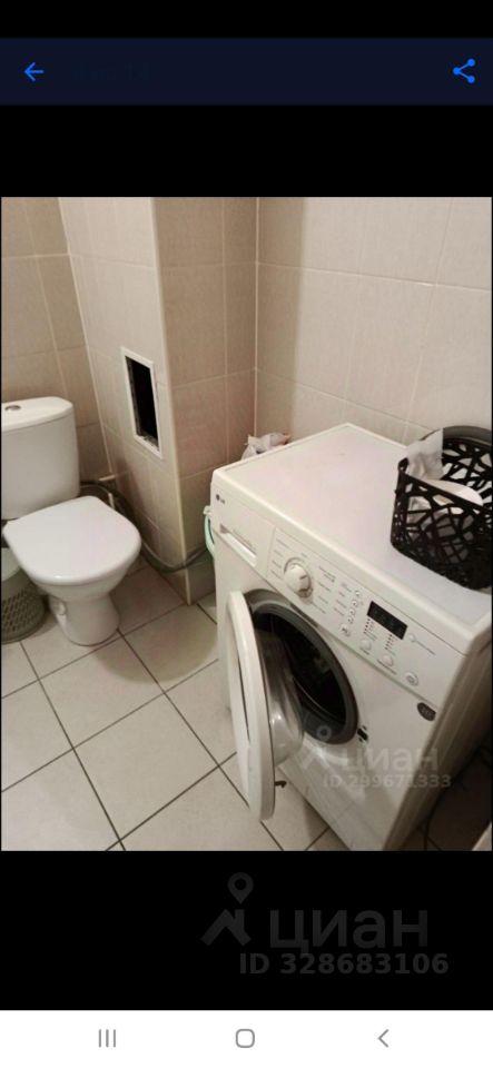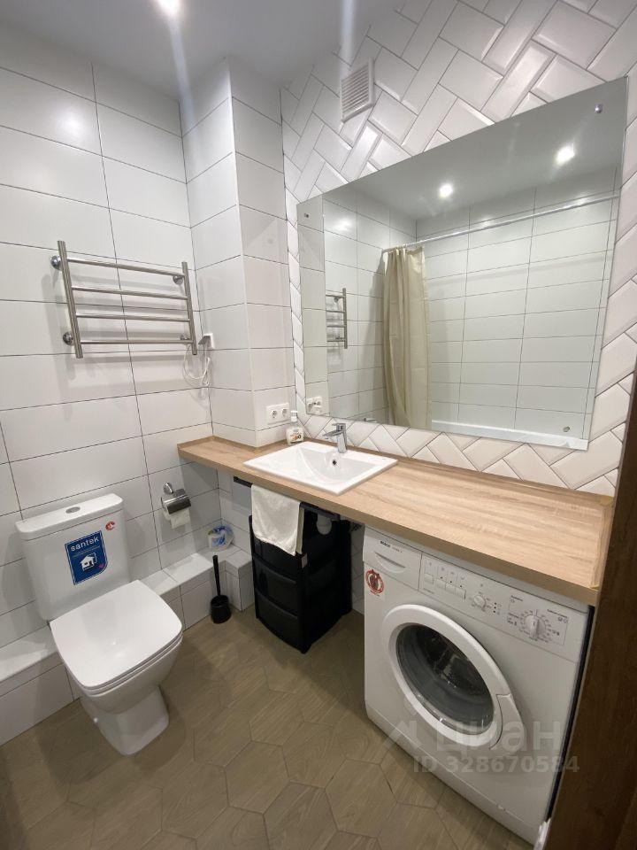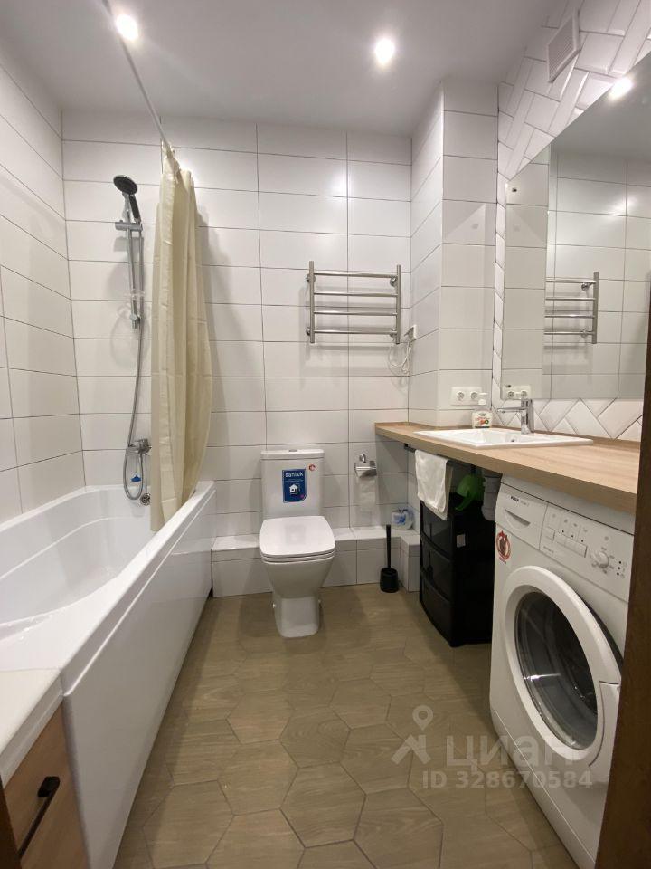 Ванная комната совмещенная, оформлена в светлых тонах, установлена ванна и стиральная машина. Лоджия застеклена, что добавляет дополнительное пространство и уют.
