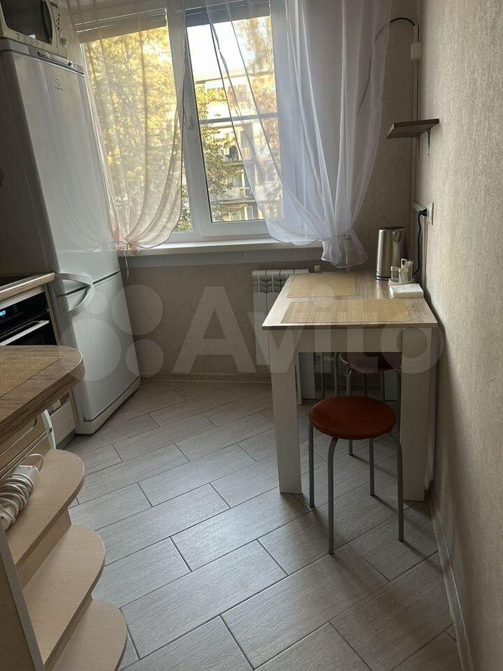 Кухня оборудована необходимой бытовой техникой, включая холодильник и плиту. Есть обеденный стол и стулья. Ванная комната и туалет раздельные, выполнены в светлых тонах.