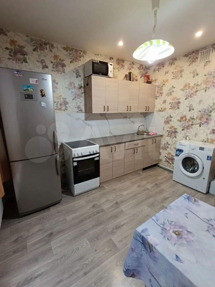 В квартире выполнен косметический ремонт. Просторная кухня оборудована необходимой техникой, включая холодильник и стиральную машину. В комнате установлен диван и телевизор с кабельным/цифровым ТВ.