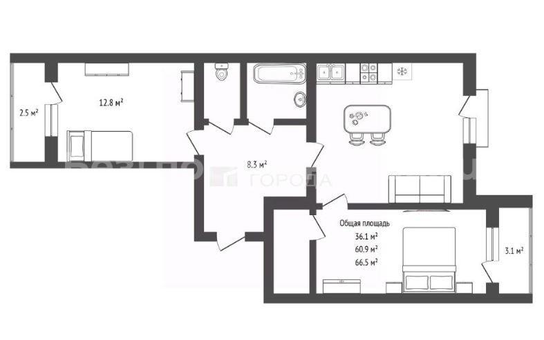 Квартира расположена на высоком первом этаже четырёхэтажного кирпичного дома, построенного в 2020 году. Высота потолков — 2,7 метра, что создаёт ощущение простора. Общая площадь квартиры без коэффициента площади лоджий составляет 60,9 кв. м, из которых 36,1 кв. м — жилая площадь, а 12,8 кв. м — просторная кухня. Две лоджии - 2,5 кв.м и 3,1 кв.м.