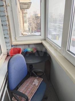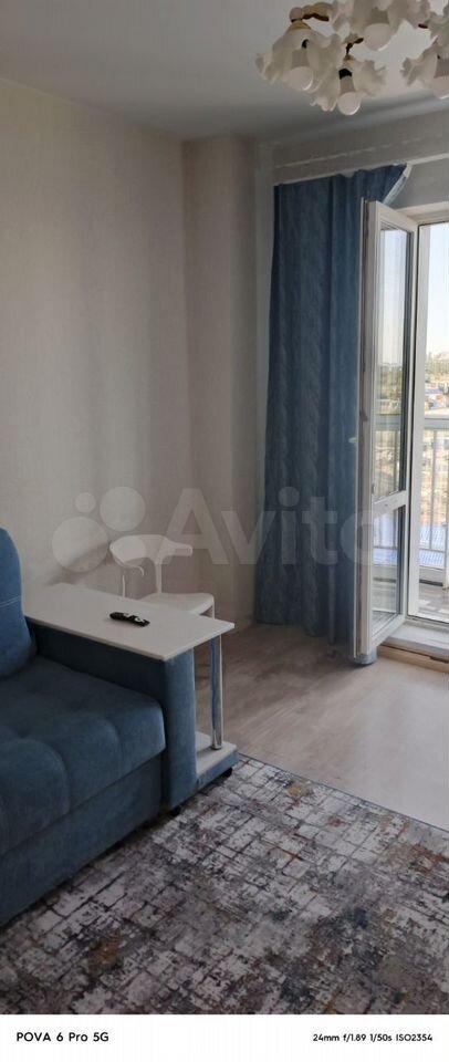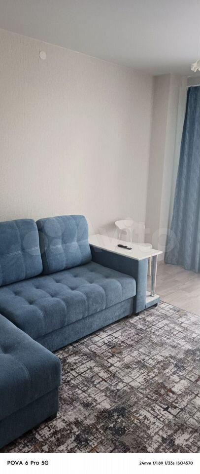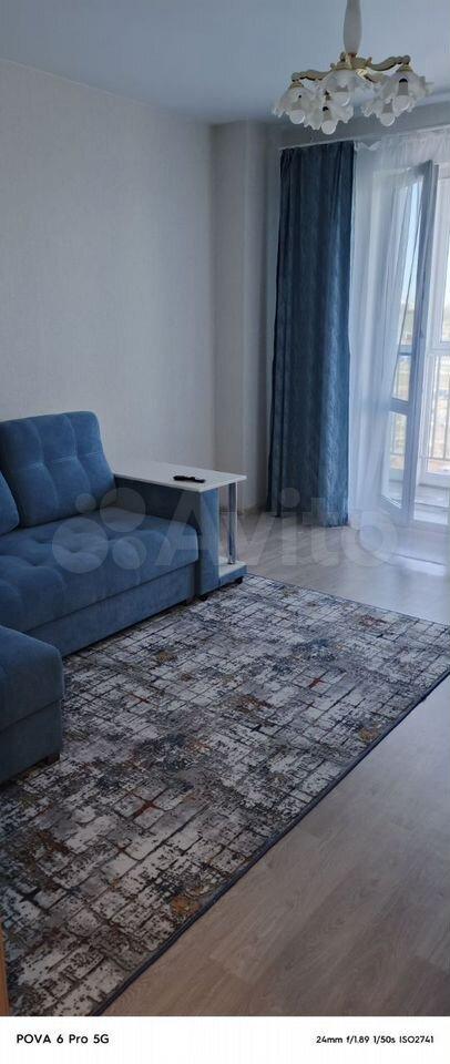 В квартире выполнен свежий евро ремонт. Просторная гостиная с выходом на застеклённую лоджию, где можно наслаждаться видом на город. В комнате установлен современный диван и телевизор.