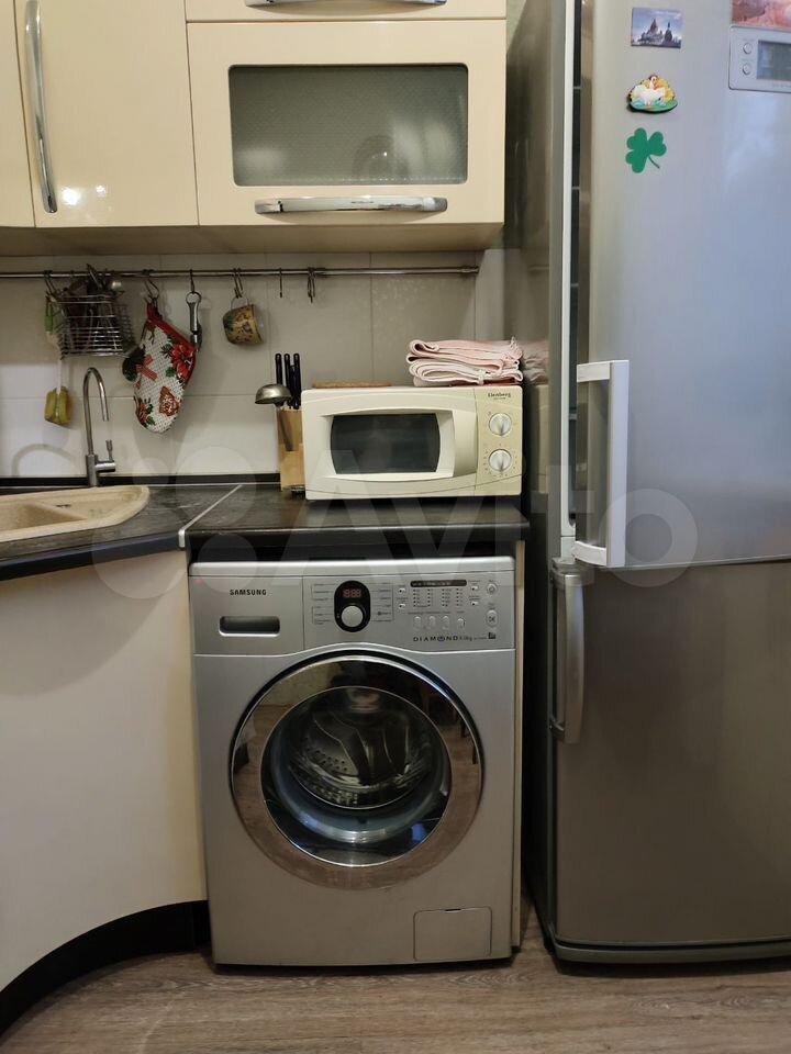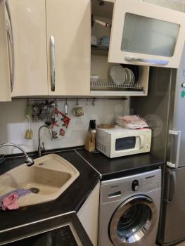 Кухня оборудована необходимой техникой: холодильник, плита, микроволновая печь и стиральная машина. Санузел совмещённый, оснащён ванной и душевой кабиной.