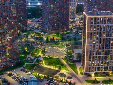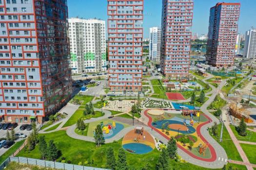 Территория жилого комплекса огорожена, есть охранники и видеонаблюдение, на въезде/выезде стоят шлагбаумы. На дворовой территории нет автомобилей. Парковая зона состоит из множества зон отдыха, спортивных и детских площадок для разных возрастов.