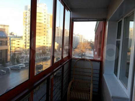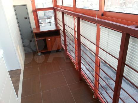 Огромная лоджия с полностью прозрачным фасадом. Сторона солнечная, поэтому на окнах лоджии установлены жалюзи.