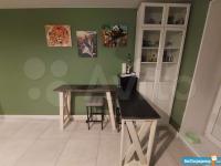 · Мебель: кухонный гарнитур, 2 барные стойки, 2 барных стула, шкаф закрытый; в комнате рабочий стол и 2 стула к нему, раскладной диван, раскладывающийся журнальный стол, кровать, напольные тумбочки, шкаф с открытыми полками в ванной и в комнате. На лоджии также есть журнальный стол.