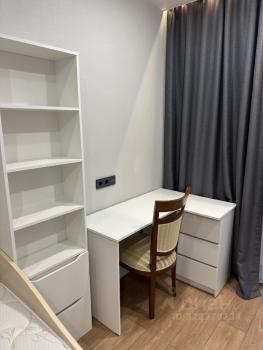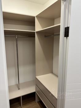 В спальне есть кровать, комод, зеркало и рабочий стол со стулом. Также имеется гардеробная, в которой очень много места для хранения вещей.