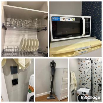 Квартира полностью укомплектована мебелью и техникой. Плита, холодильник, микроволновка (Samsung), посудомоечная машина, духовка, пылесос, телевизор, стиральная машина. Есть стаканы, тарелки, ложки, вилки , ножи, кружки, сковородка, кастрюля, лист для выпекания. В ванной висят полотенца, в спальне есть постельное белье. В квартире уже есть вай-фай и телевизор с приложением такие как KION, Кинопоиск, IVI и другие. При желании вы можете скачать что-то свое. В зале диван разбирается и спокойно могут поместиться два человека. Вся техника и мебель современная и в идеальном состоянии, так как пользовались совсем недолго. Имеется один балкон, который очень просторный. Санузел оборудован душевой кабиной, зеркалом с подсветкой, гигиеническим душем, вентиляцией и теплым полом.
