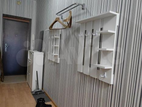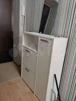 В прихожей большой и вместительный зеркальный( от потолка в пол) шкаф, комод и вешалка..