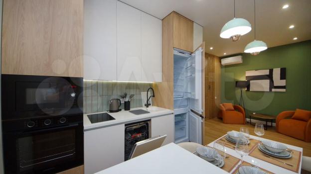 санузел - совмещённый, мебель - кухня, хранение одежды, спальные места, кондиционер, холодильник, плита, микроволновка, стиральная машина, посудомоечная машина, водонагреватель, телевизор.