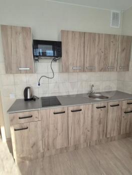 Кухня совмещена с гостиной оснащена всем необходимым, включая холодильник, плиту,духовку. В гостиной установлен кондиционер, а также имеется диван.В спальне -шкафы.