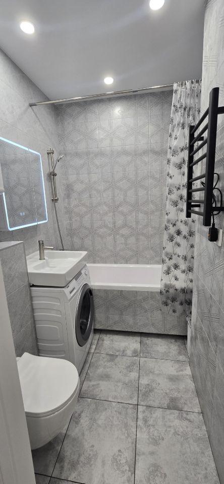 Просторный санузел будет радовать Вас красивым, разнообразным освещением и стильным дизайном . Отделка - керамогранит.
