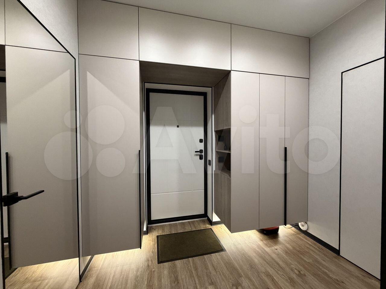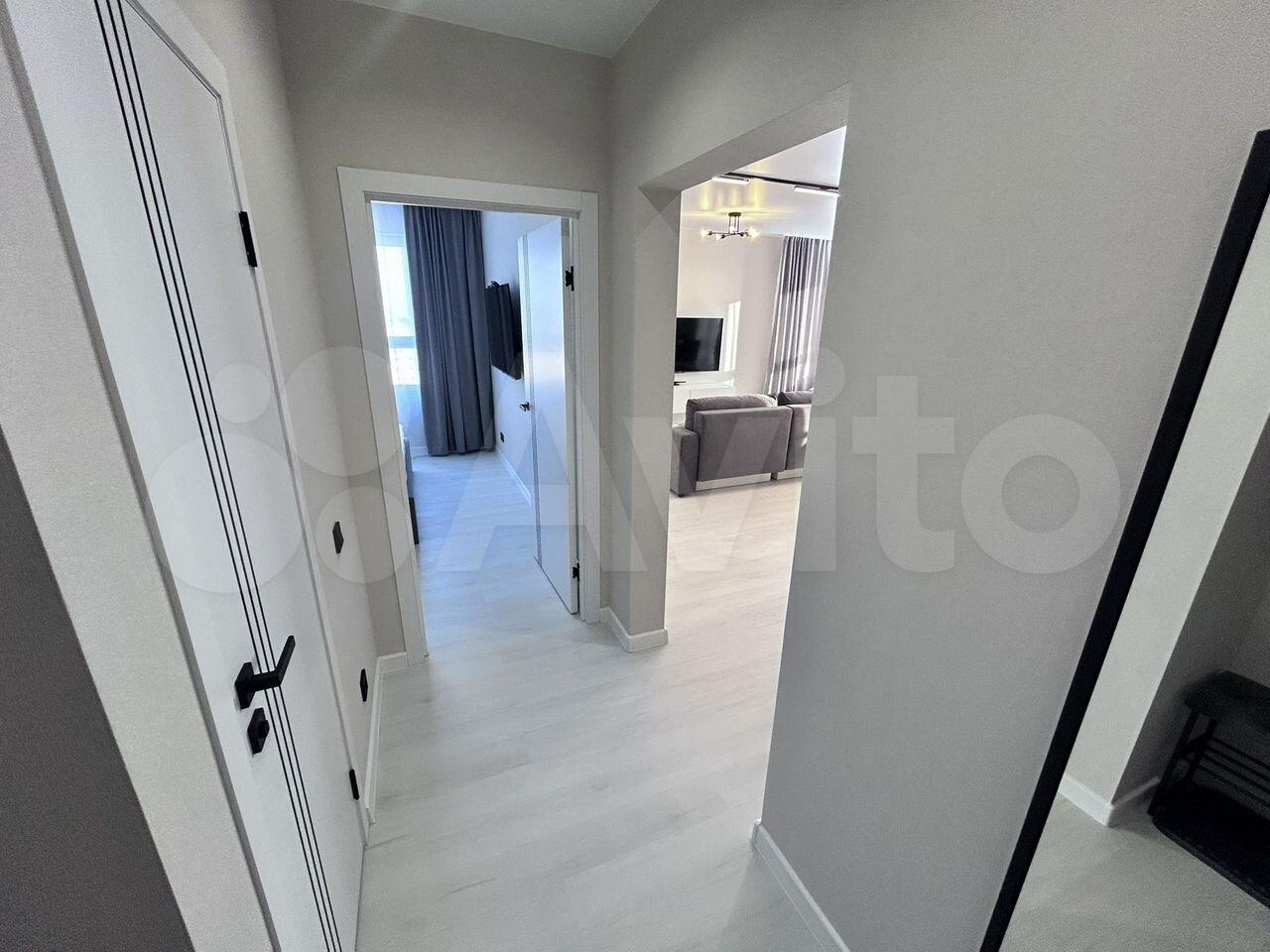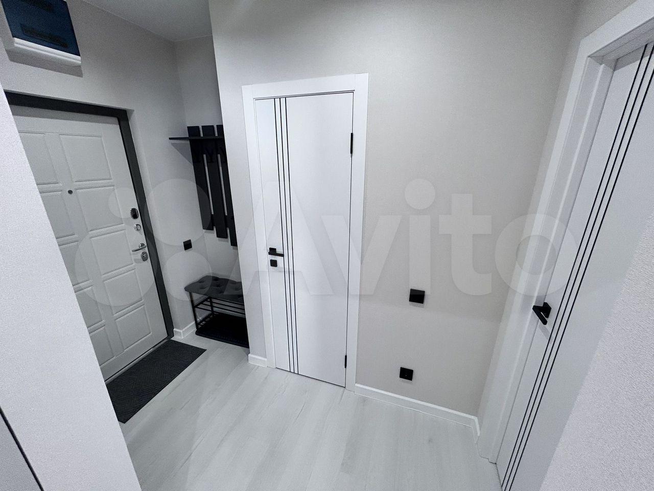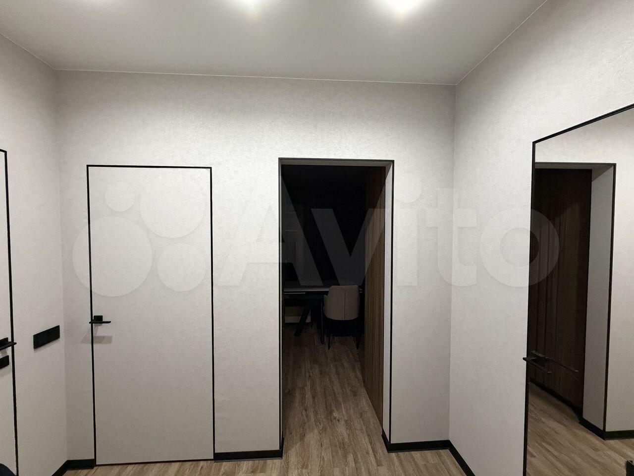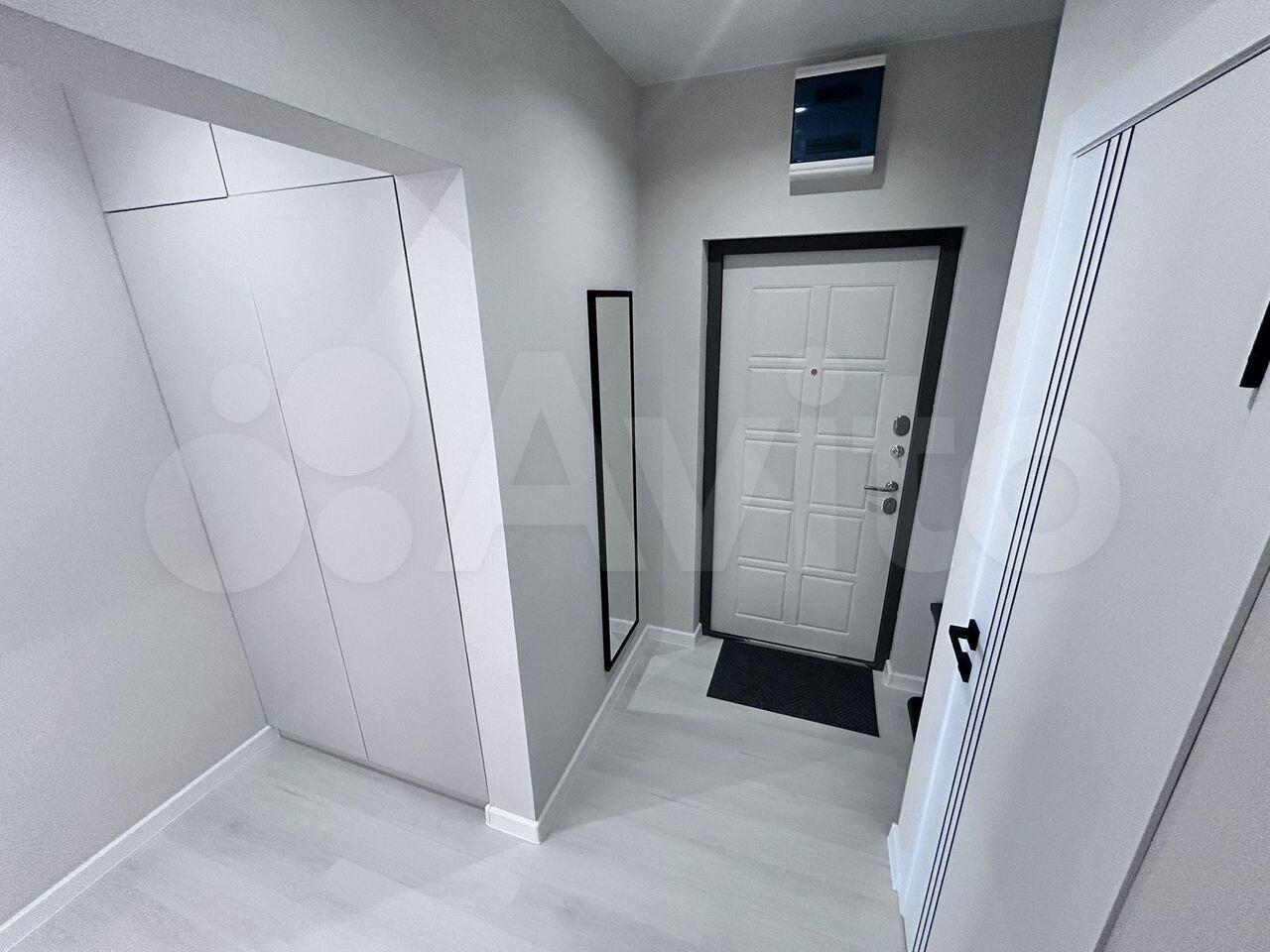 В комнaтax новый pемонт, но нет мебели. Есть кухонный стол, в коридоре вместительный шкаф.