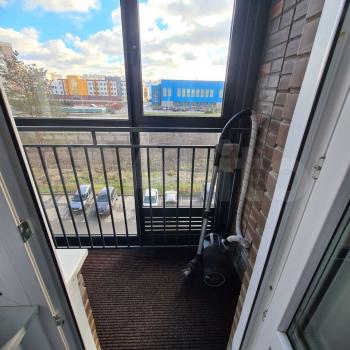 Окна выходят на бассейн и школу (через дорогу), из каждой комнаты и кухни выход на лоджию (8кв.м).