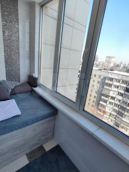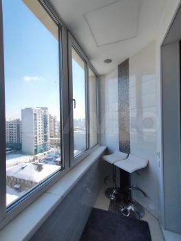 Лоджия с теплым полом и шикарным видом на город, мягким топчаном и местом для хранения под ним, аудио система, два барных стула и атмосферная подсветка.