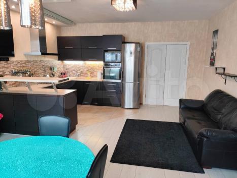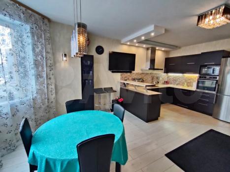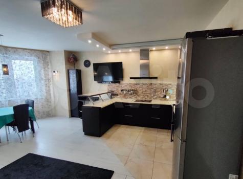 В кухне-гостиной имеется посудомоечная машина, духовой шкаф, микроволновая печь, варочная панель, вытяжка, множество кухонных шкафов для хранения, большой вместительный холодильник с морозильной камерой, кожаный раскладной диван, обеденный раскладной стол, 4 стула, 2 барных стула, смарт телевизор, саунд-панель с сабвуфером, комод, стеклянный шкаф для посуды, теплый пол в зоне кафеля кухни.