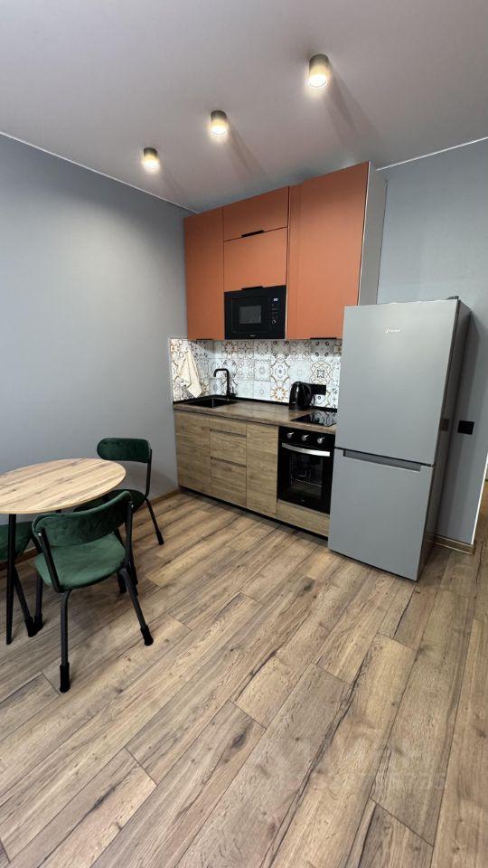 Комнаты смежные, светлые и просторные. В гостиной установлен удобный диван и обеденный стол. Кухня компактная, оборудована необходимой техникой: холодильник, плита, микроволновая печь и стиральная машина. Ванная комната совмещенная, с душевой кабиной и современной сантехникой.