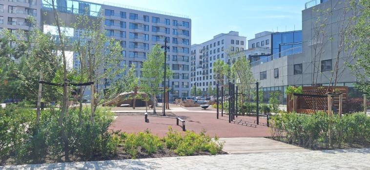 шикарный ухоженный закрытый двор! без машин. места очень много! локации для детей и взрослых, для игр и спорта. зимой на футбольном поле заливают каток, играет новогодняя музыка.