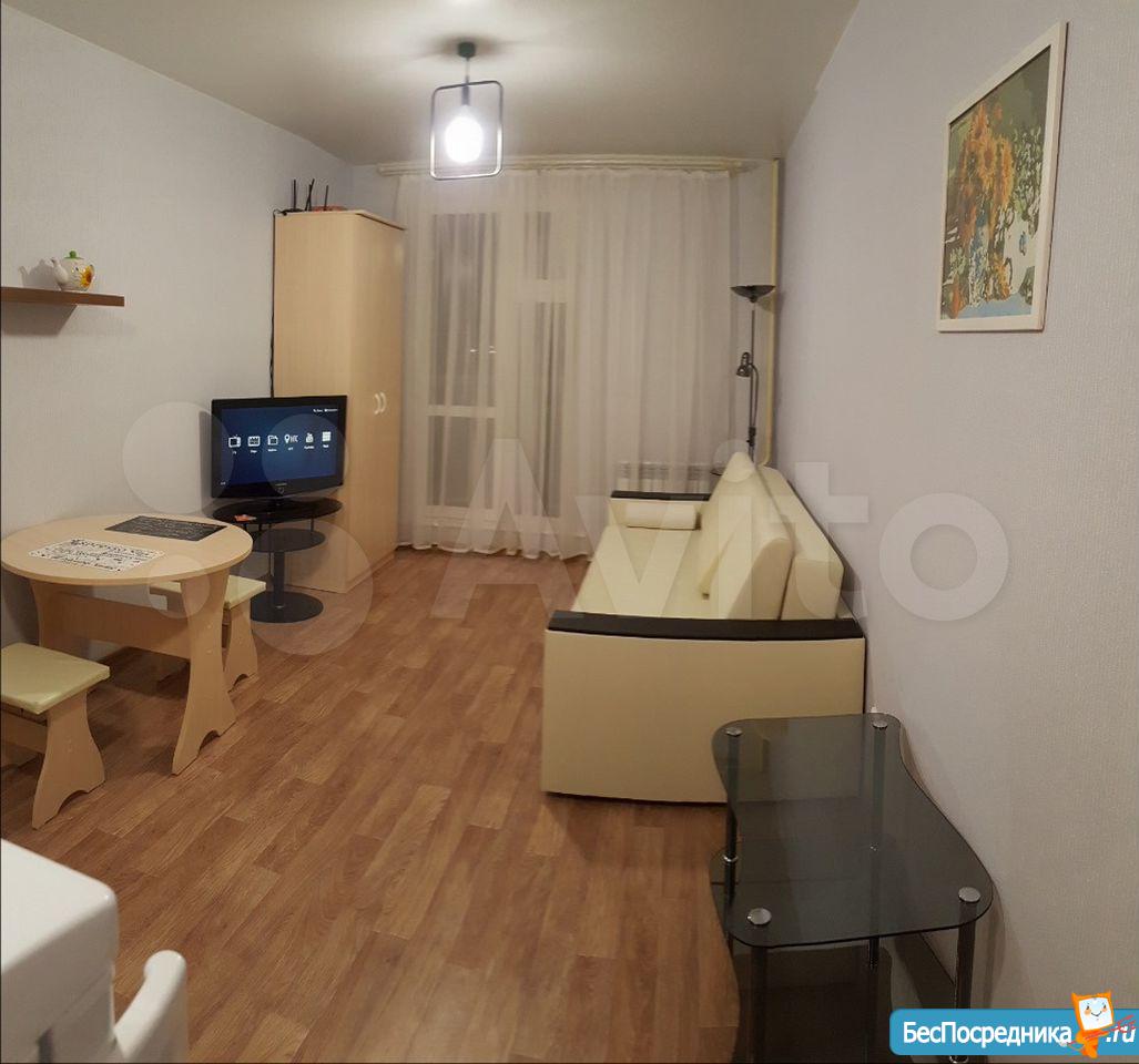 Сдается квартира-студия на ж/м Радуга Сибири. Сделан хороший ремонт, есть мебель. В доме есть 2 магазина, недалеко магазин "Пятерочка" и остановка общественного транспорта.