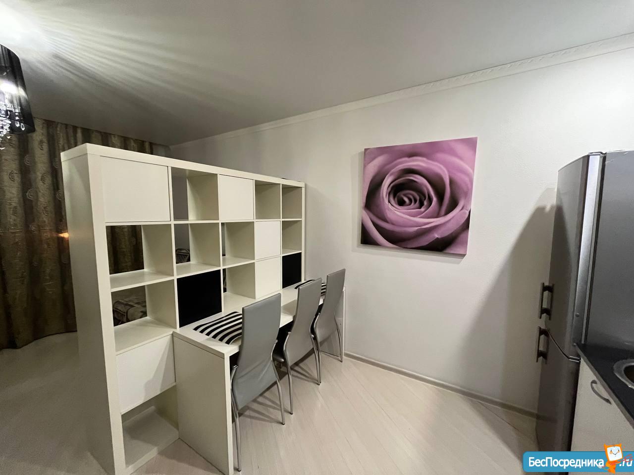 Уютная квартира-студия. Есть вся необходимая мебель и техника. Удобный выезд из двора. Хорошие соседи. Окна выходят на частный сектор, нет шума с улицы