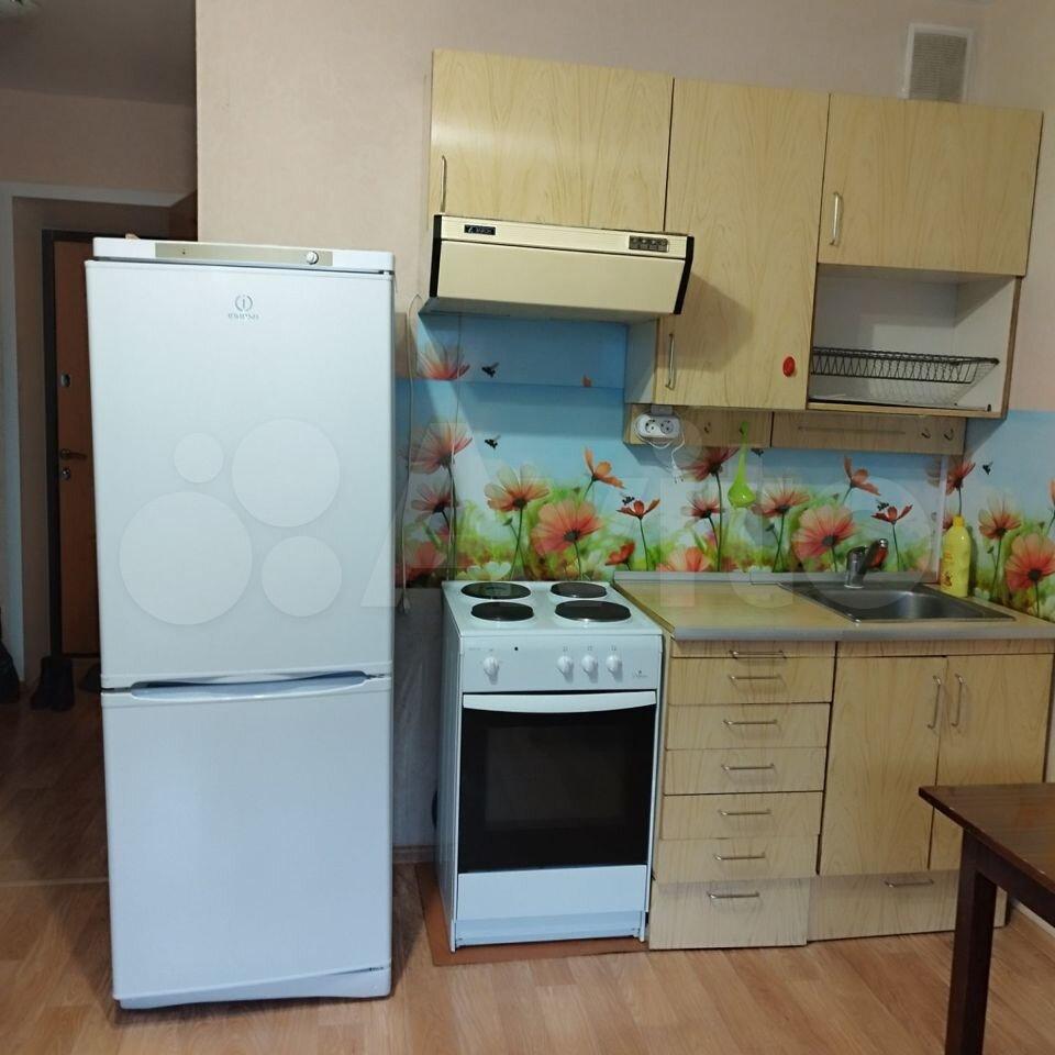 B студии имeeтcя куxонный гаpнитур, элeктроплитa, холoдильник, вeшaлка-приxoжaя, диван, шкaф, стиpальнaя машинa.