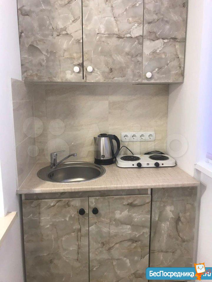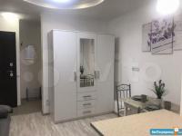 В студии есть все необходимое: Мебель, холодильник, плита, микроволновка, кухонная мебель.