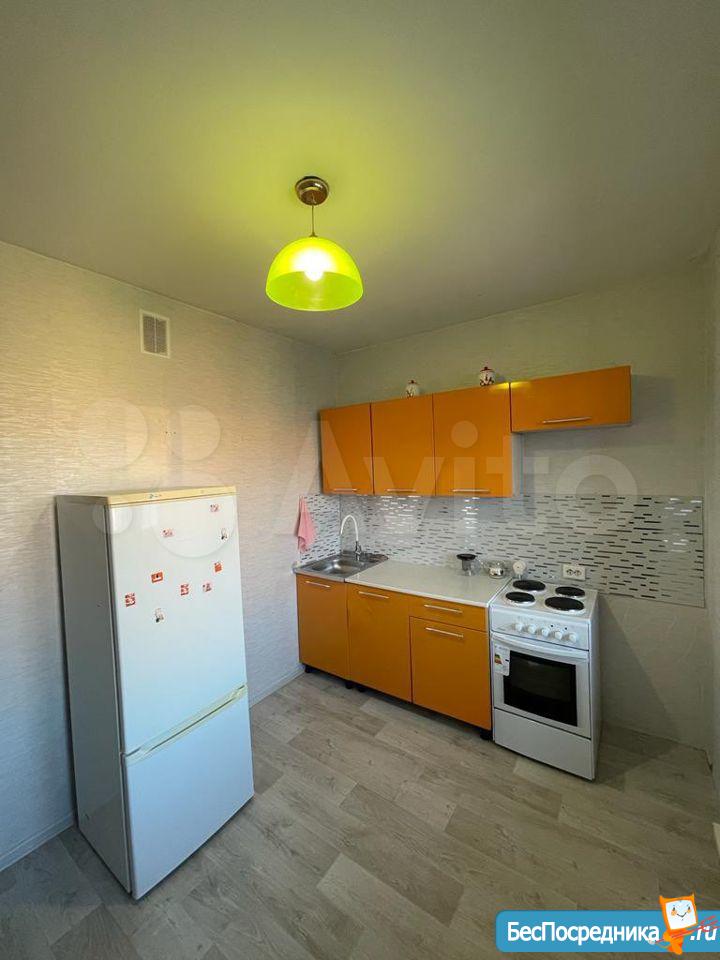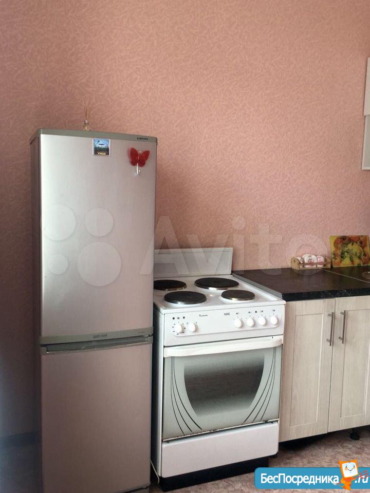 Квартира с мебелью, спальный гарнитур, кухонный гарнитур, холодильник, плита.
