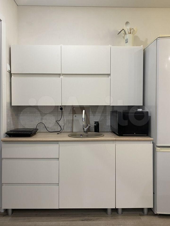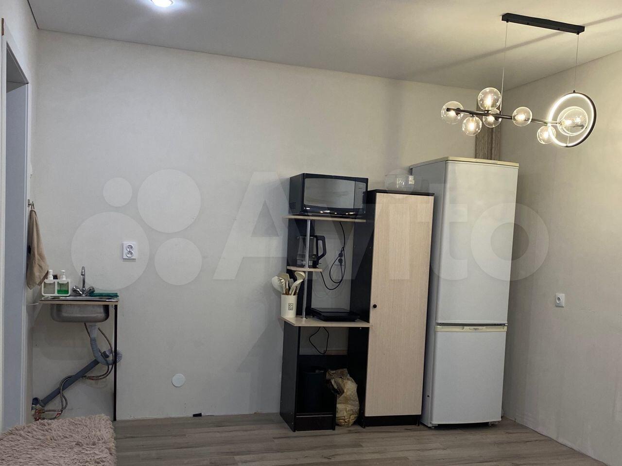 В наличии: кухонный гарнитур, индукционная плита (с посудой), холодильник, диван, стол, стиральная машина.