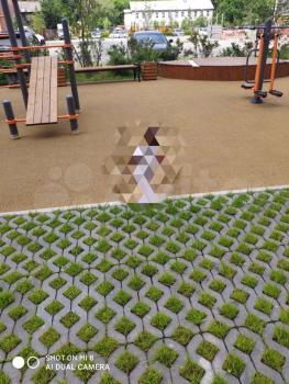 Современная отгороженная территория с детскими площадками, парковка за шлагбаумом.