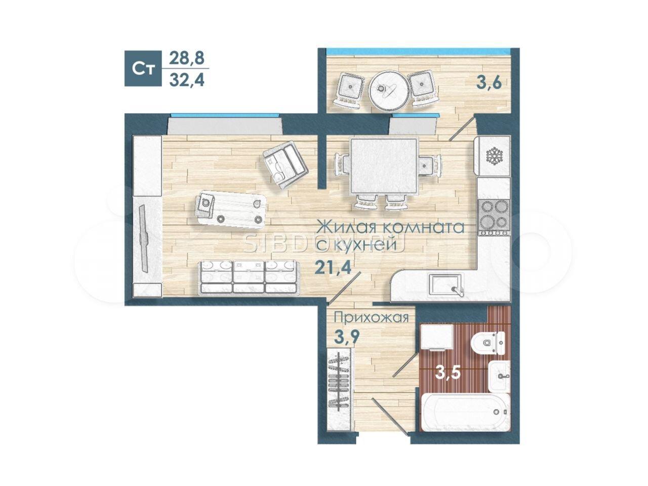 Общая площадь квартиры 32.4 м2 с лоджией.