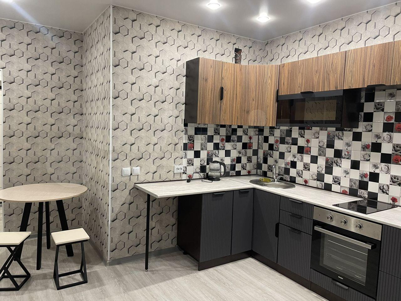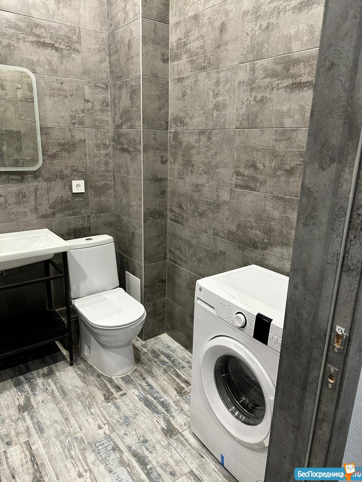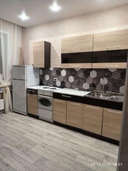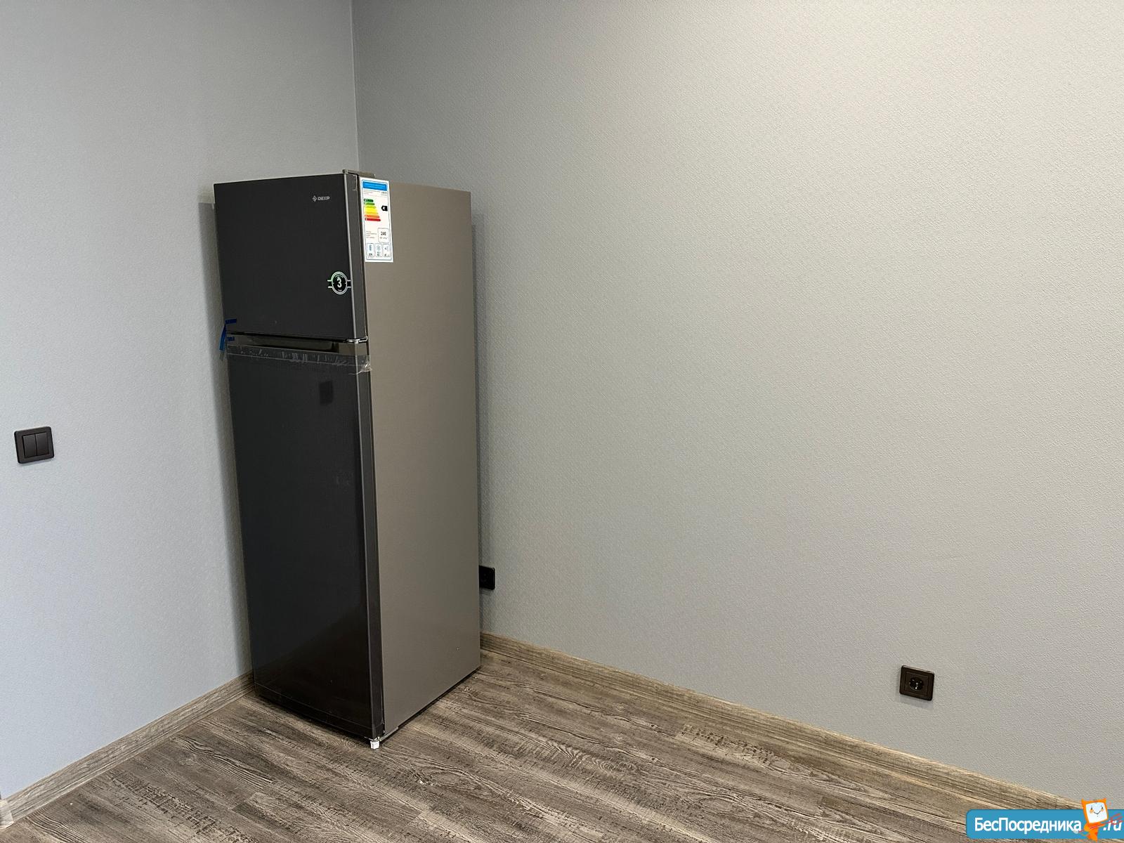 Новая бытовая техника (телевизор, холодильник, плита, микроволновка, стиральная машина) и мебель (на фото нет, но в квартире будет большой шкаф и двуспальный диван).