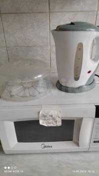 В квартире есть: холодильник, чайник, микроволновка, духовка, электроплита, стиральная машинка-автомат, вся техника в отличном состоянии, есть гладилка, утюг, принадлежности для уборки (швабра, ведра), в комнате двухспальная кровать, шкаф-купе, небольшой телевизор.