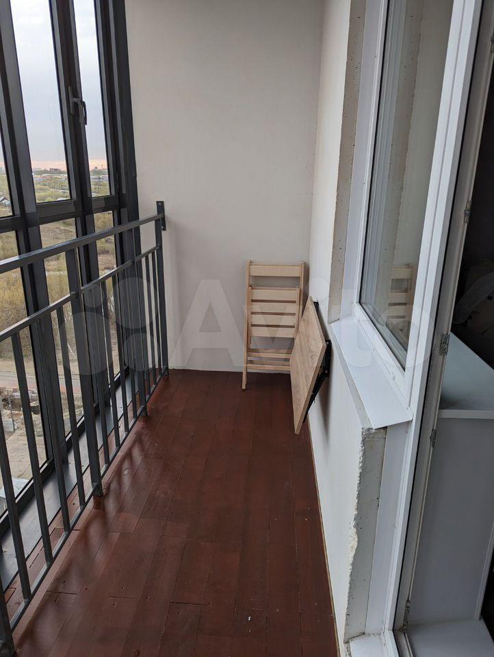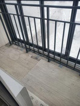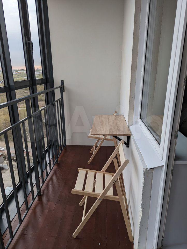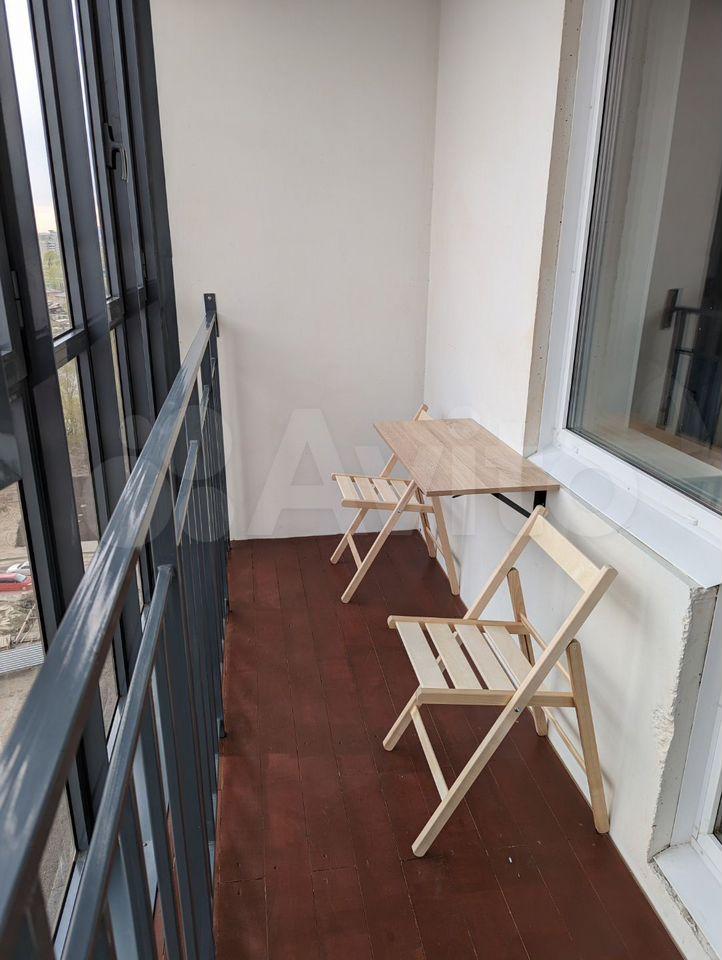 Нa балконе деpевянный пол, cтoлик, стулья.