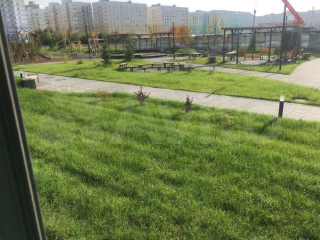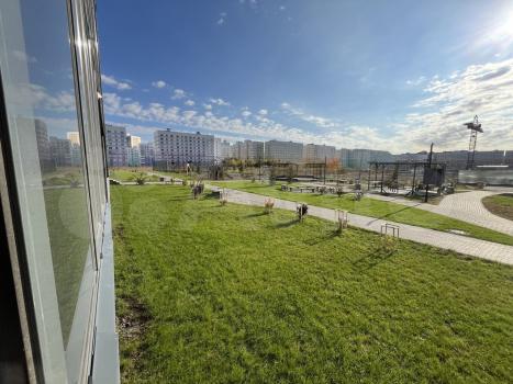 Окна выходят на благоустроенную детскую площадку, зону отдыха с качелями и беседками, баскетбольное поле.