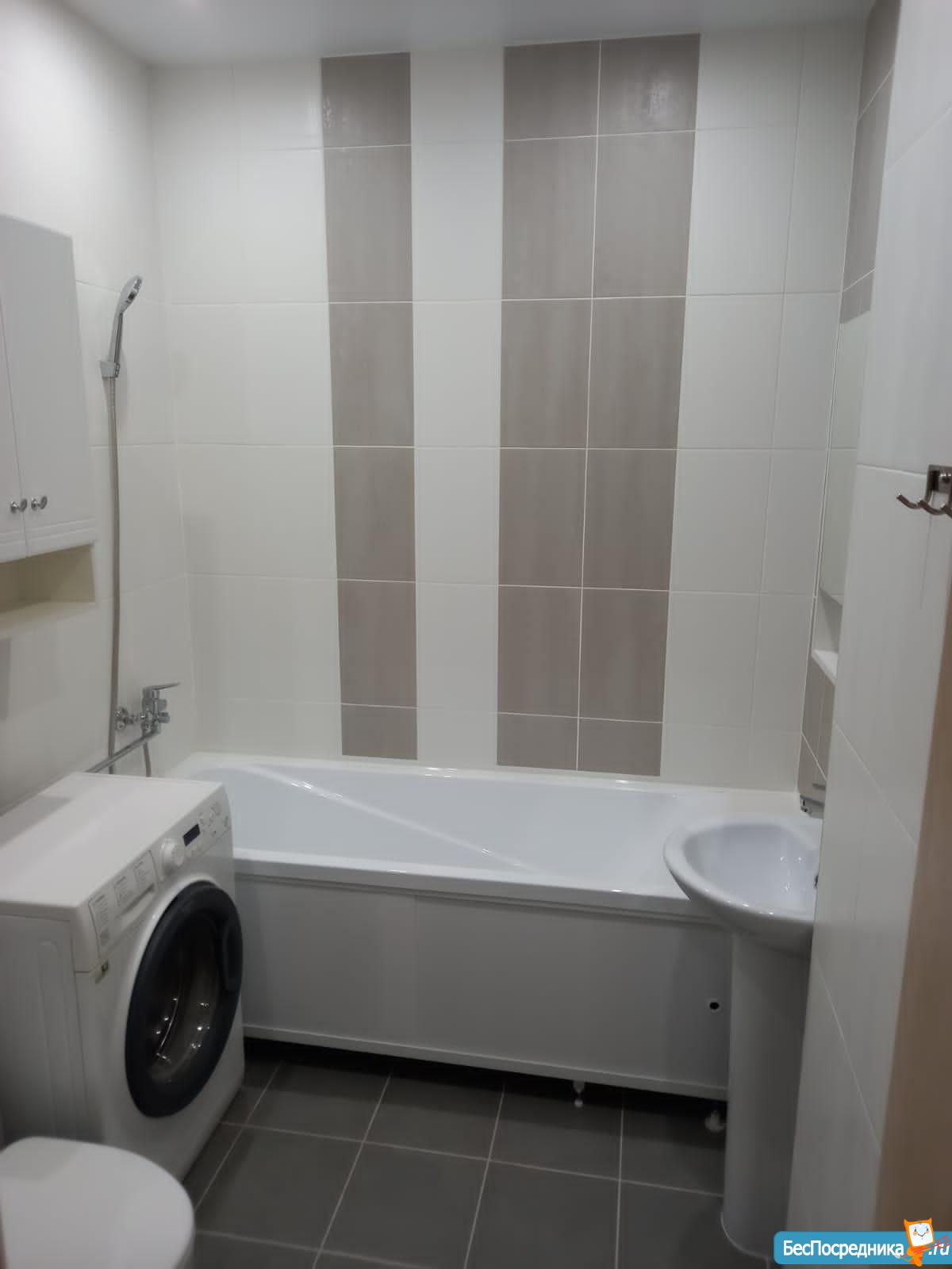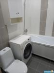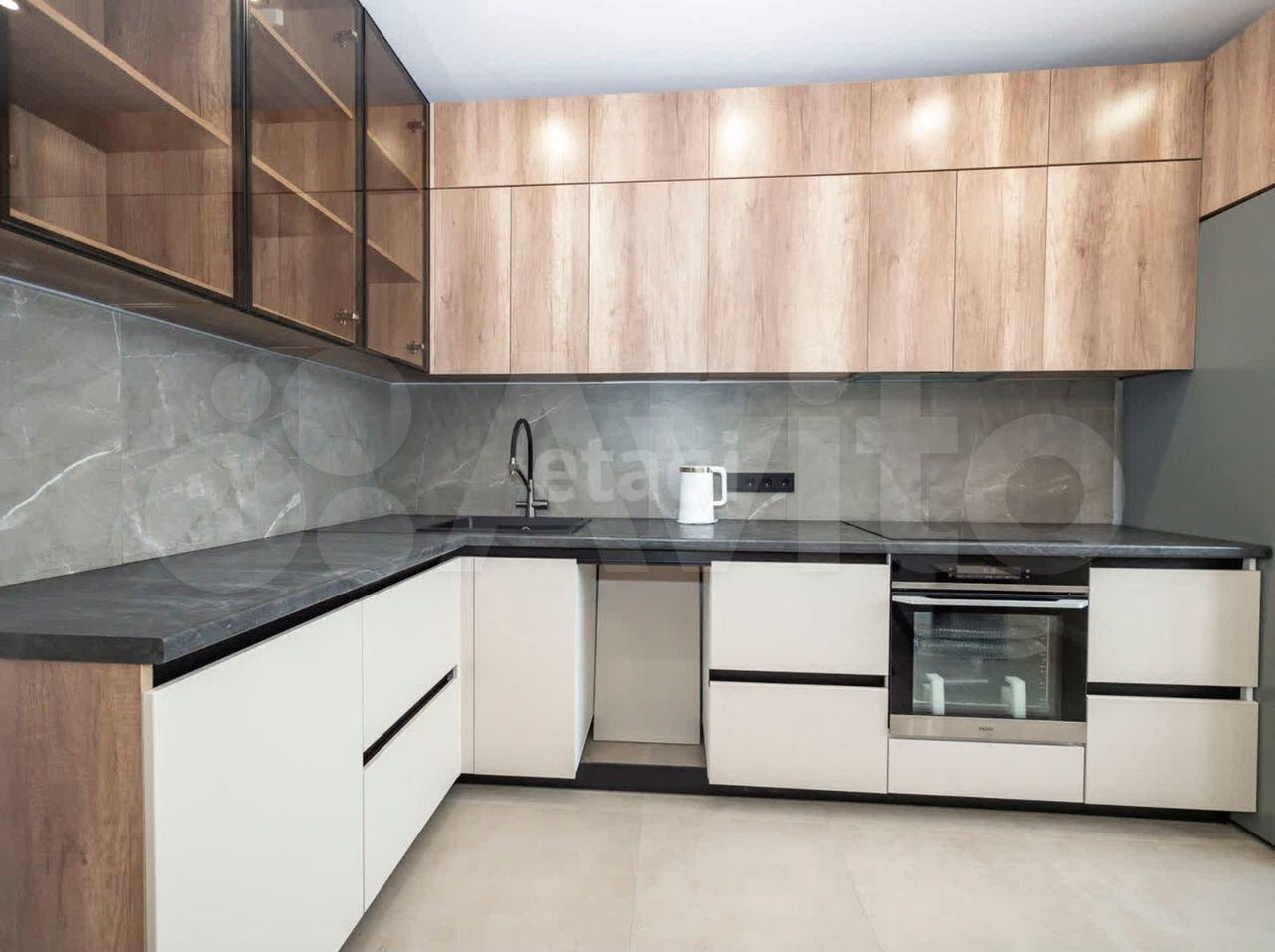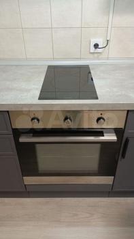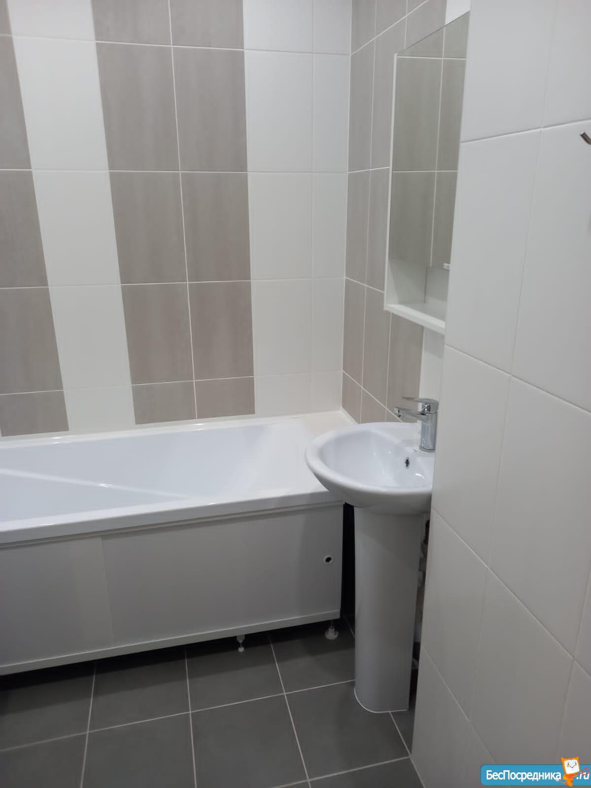 В квартире новая кухня и шкаф, раковина в ванной с тумбой .