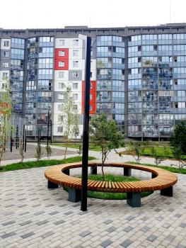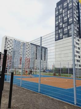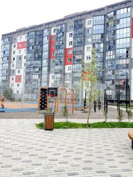 Двор дома с современной детской площадкой,есть баскетбольная площадка, большая парковка.