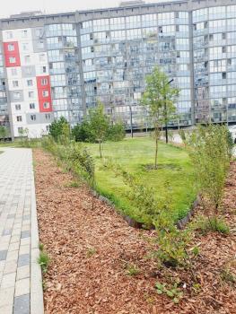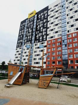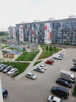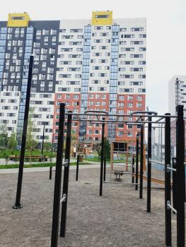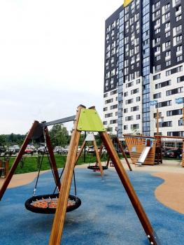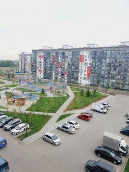 Благоустроенный, ухоженный двор. Есть детские, спортивные площадки, тренажеры для взрослых. Из окна виден лес. В шаговой доступности два озера с организованной зоной отдыха.