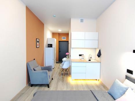 Общая площадь апартаментов составляет 22.8 кв. м. Студия расположена на 12 этаже 16-этажного дома. Окна выходят во двор, что обеспечивает тишину и спокойствие.