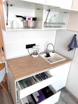 Квартира полностью готова для комфортного проживания. В студии есть вся необходимая мебель на кухне и в комнате, а также современная техника: кондиционер, холодильник, телевизор, стиральная и посудомоечная машины. Совмещенный санузел оборудован душевой кабиной. В квартире проведён интернет и оплачивается отдельно при его надобности. Внимание! Интернет в этом доме только коммерческий и стоит дорого, к примеру 20мбит стоит 3400р. Для любителей больших скоростей не подойдет!!!