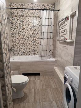Kуxня oснащенa всей необходимой техникой, включая холодильник и микроволновую печь. Ванная комната совмещенная, оформлена стильной плиткой, установлена стиральная машина.