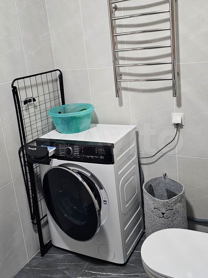 Санузел совмещённый, оформлен в светлых тонах, оборудован современной сантехникой и стиральной машиной. Имеется утюг, гладильная доска, сушка для белья.