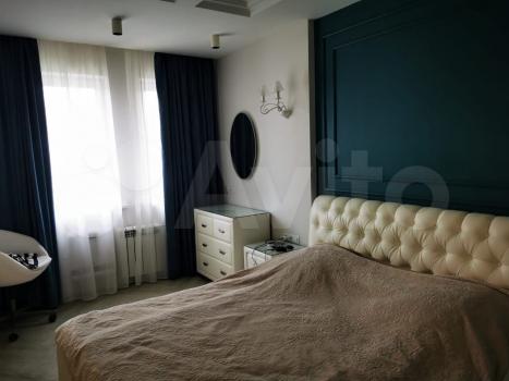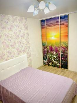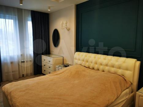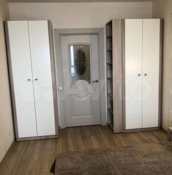 В спальне большая кровать ,два удобных шкафа с зеркалом ,прикроватная тумба ,компьютерный стол