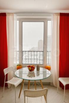 стол, стулья). Из окон открывается вид на
