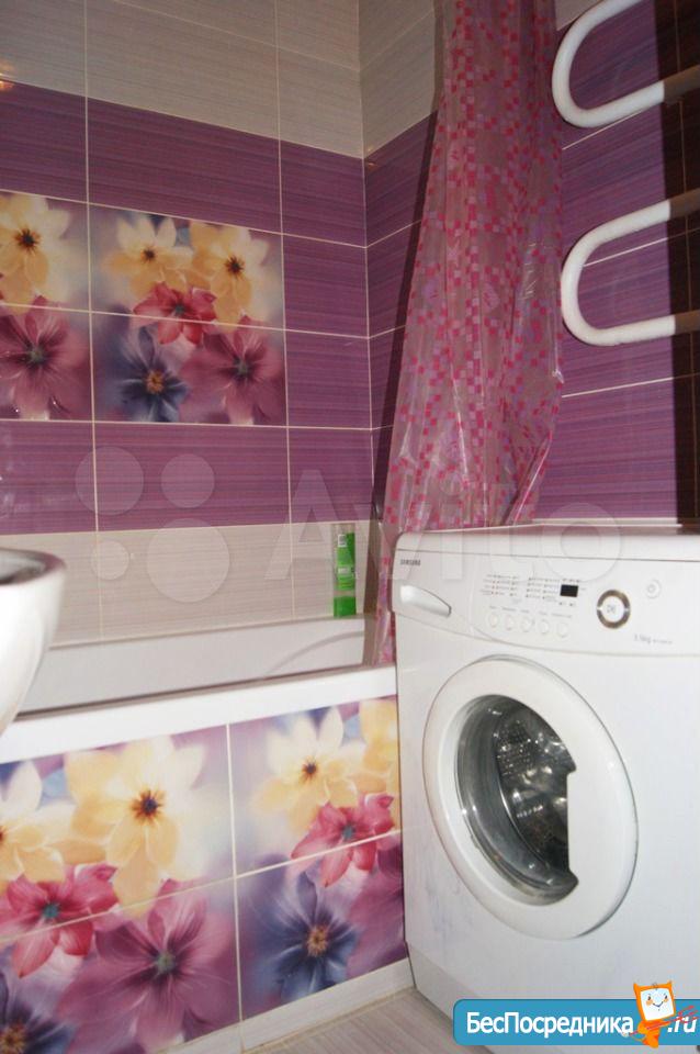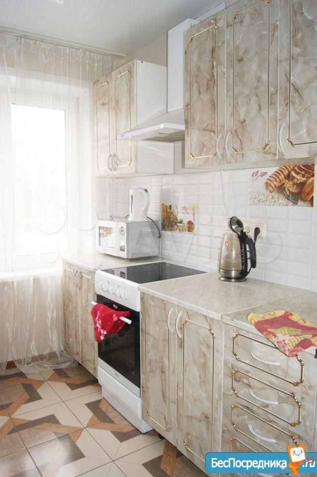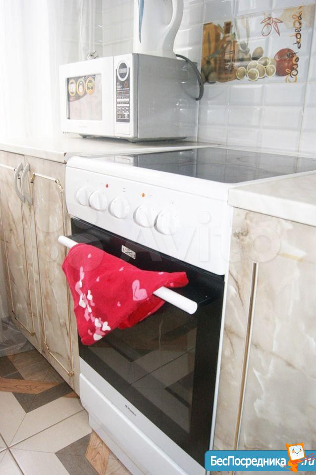 Мебель и бытовая техника в наличии (стиральная машинка, кухонный гарнитур, холодильник, микроволновка, плитка, чайник).