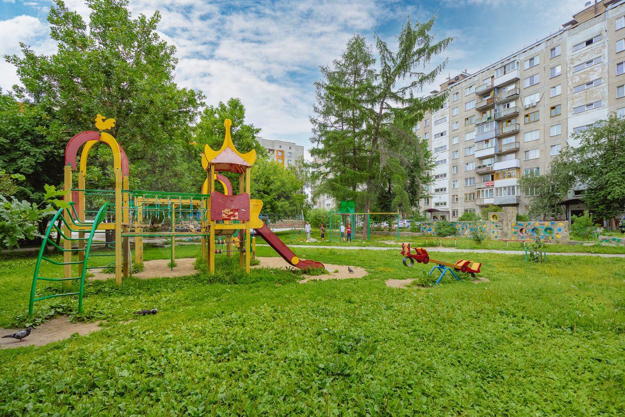 Территория дома ухожена: зелёный двор, детский городок, игровые площадки, шлагбаум во дворе.