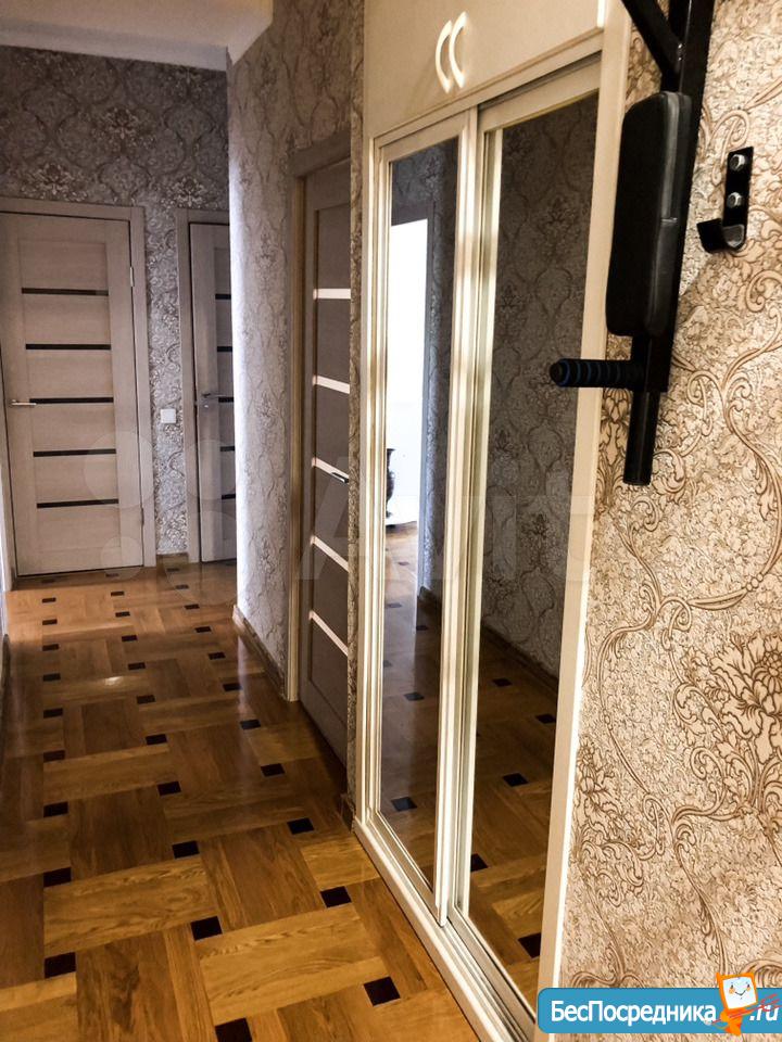 В коридоре встроенный шкаф купе и прихожая. Двойная входная дверь.