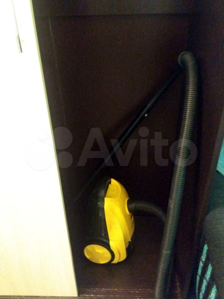 В комнате есть шкаф, журнальный столик, диван, обувница, пылесос, микроволновка, холодильник, чайник, стиральная машина, плита.