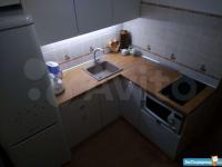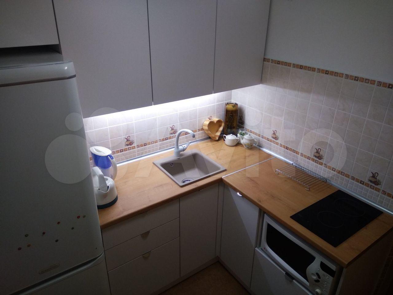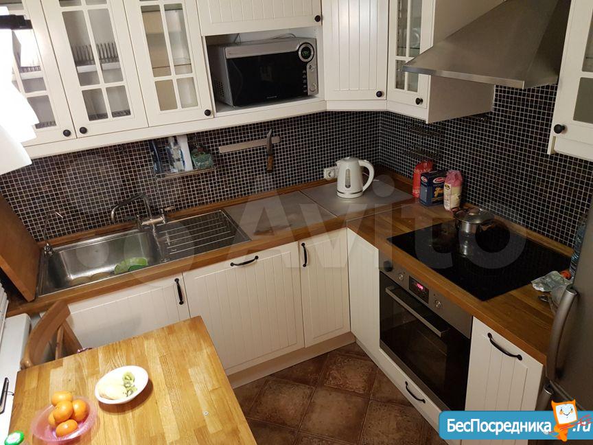 На кухне – холодильник, варочная поверхность, микроволновка, электрочайник, кухонный гарнитур.